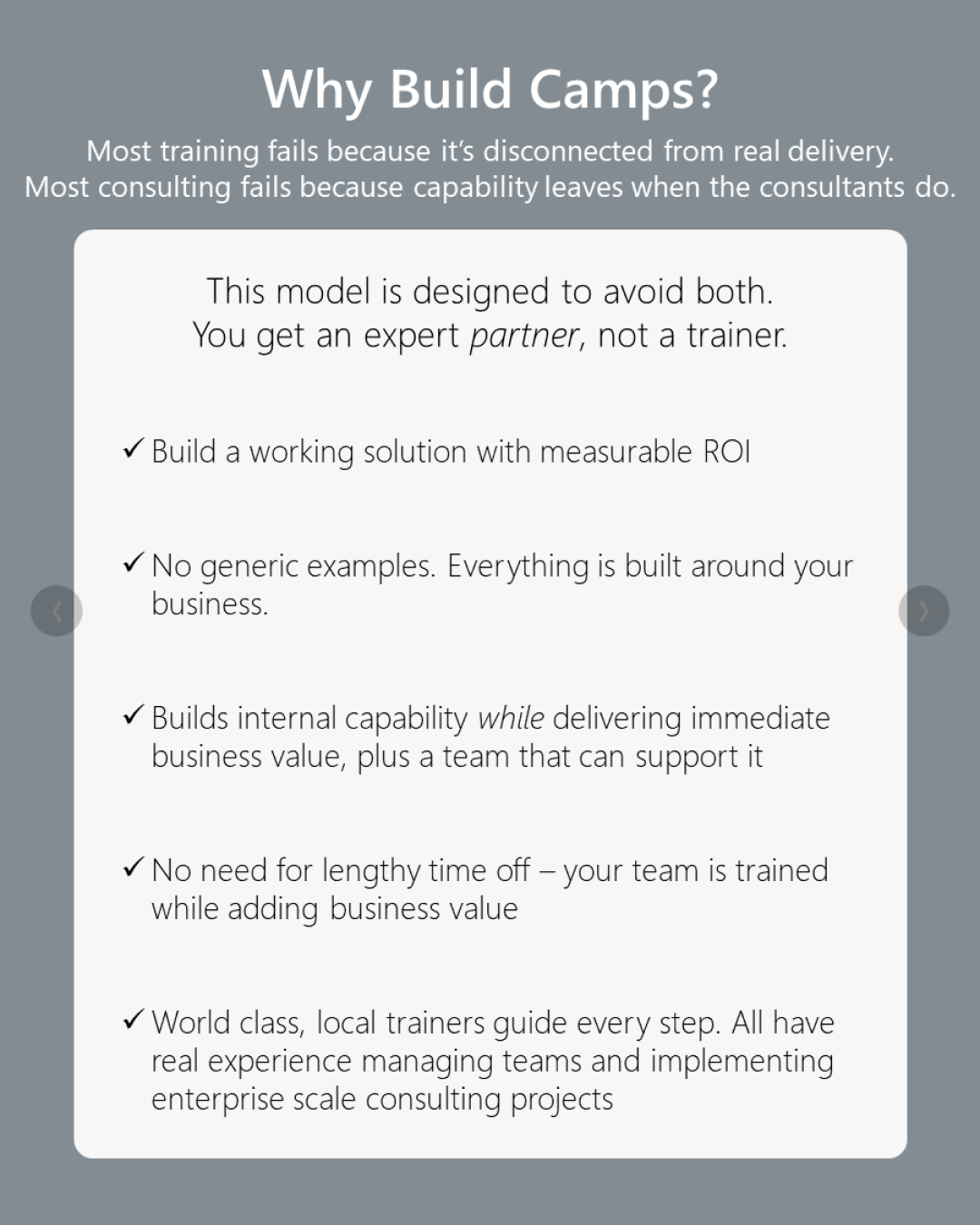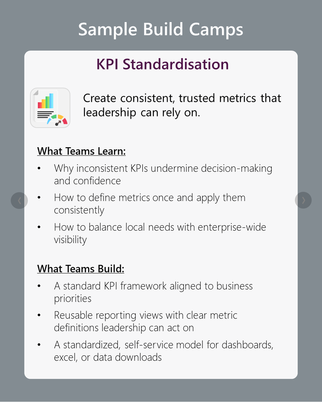 Build Camp is a unique blend of training and consulting, where your team learns by doing. After focused training sessions, they build a real, working solution, to a real business problem. Through guided sessions and expert-led development, staff gain practical skills in data and AI while creating a proof of concept (POC) using your company’s data, tools, and priorities. This approach not only builds internal capability but delivers immediate business value by solving something that matters.